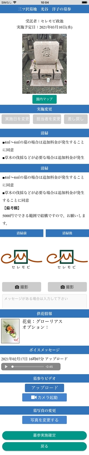 『セレモビ』は、「ユーザーが墓の写真を見ながらメッセージを録音するとスタッフがそれを流しながらお参り動画を撮影する」サービスのために開発されたスマートフォンアプリです。スタッフがアプリを使ってサービス提供することで、1回3,000円という低価格サービスを実現できます。小石川墓陵では、スタッフを源覚寺職員が務め、心のこもったお参り動画の撮影をいたします。