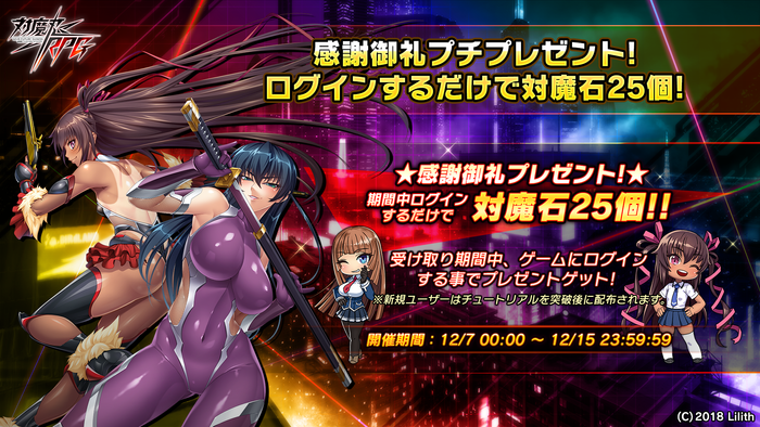 期間中にログイン頂けた方には対魔石25個プレゼントいたします!この機会に対魔忍RPGに新規登録して対魔石をGETしましょう!