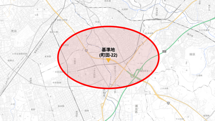今回は、基準地(町田-22)周辺の下記エリア内のマンション事例①(築10年~19年)、マンション事例②(築20年~29年)、マンション事例③(築30年~45年)を対象に、過去5年の一般市場価格を抽出します。