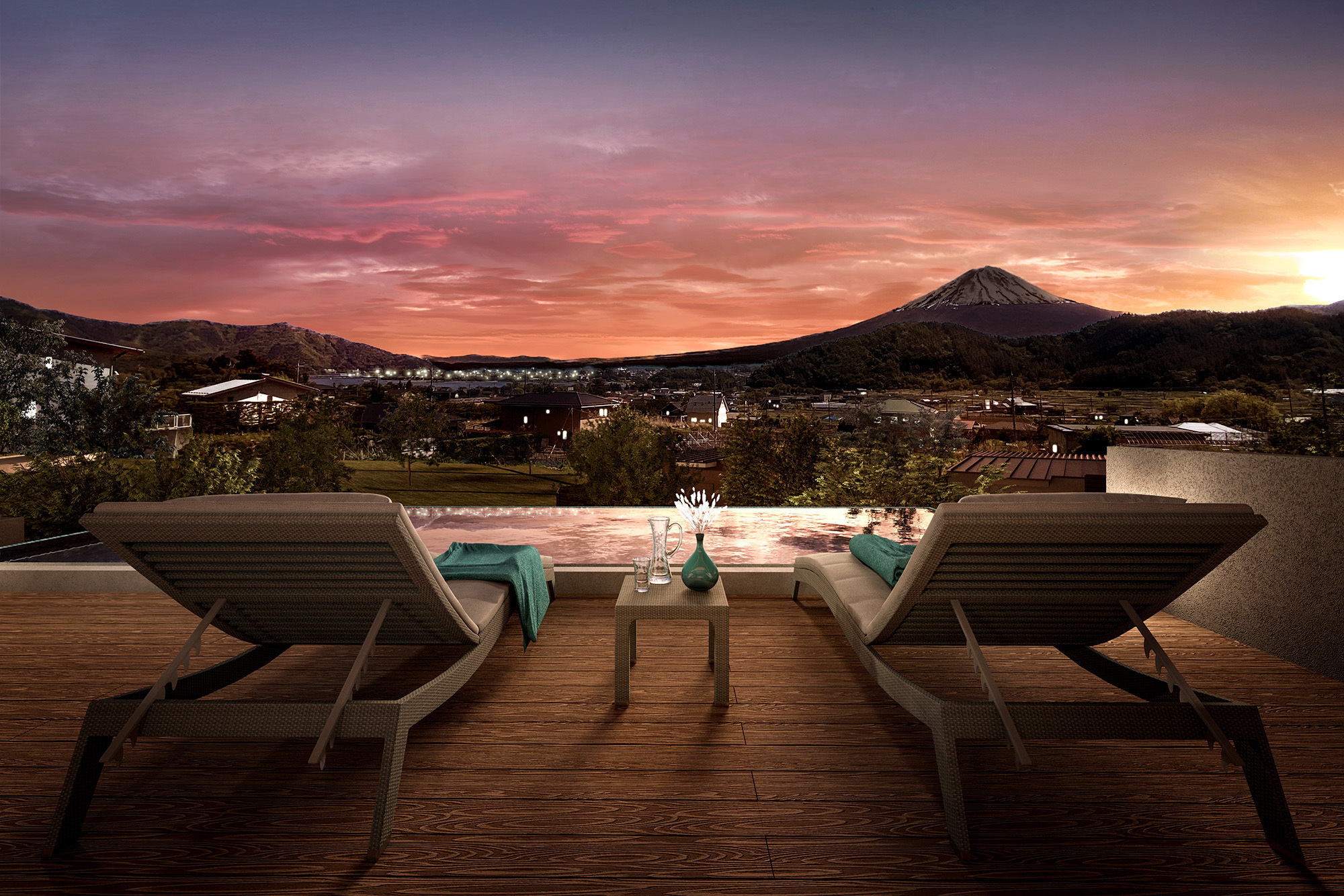 平屋建ての“ヴィラタイプ”。テラスでは、水盤のきらめきとともに富士山と河口湖を眺めながら心穏やかにおくつろぎいただけます。