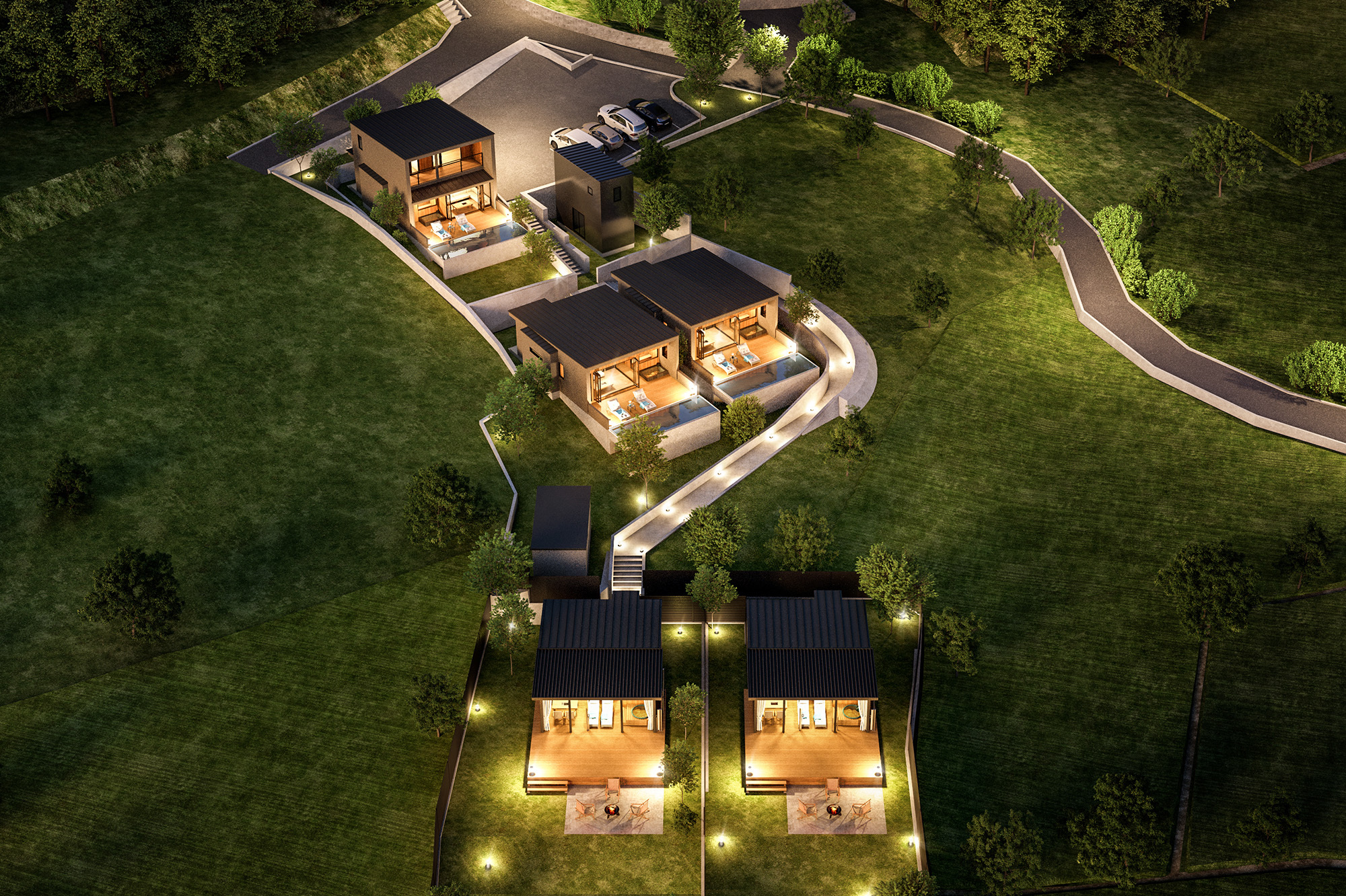 山頂付近につくられた、まさに大空に浮かぶような特別な場所に建てられた、ヴィラタイプ3棟とグランピングタイプ2棟の合計5棟。