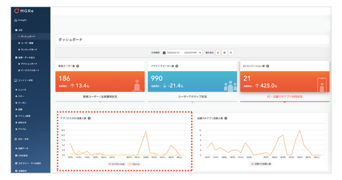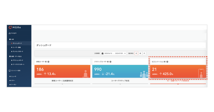 「ECコンバージョン計測」機能は、MGReのダッシュボード上で閲覧でき、アプリからECサイトへの送客数、購買数、購買プロセスなどの数値を可視化し、アプリとECサイトをつないだ購買経路分析が可能です。