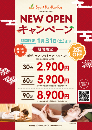 リラクゼーションスタジオSpa Re.Ra.Ku おかざき楽の湯店が12月19日にグランドオープン!