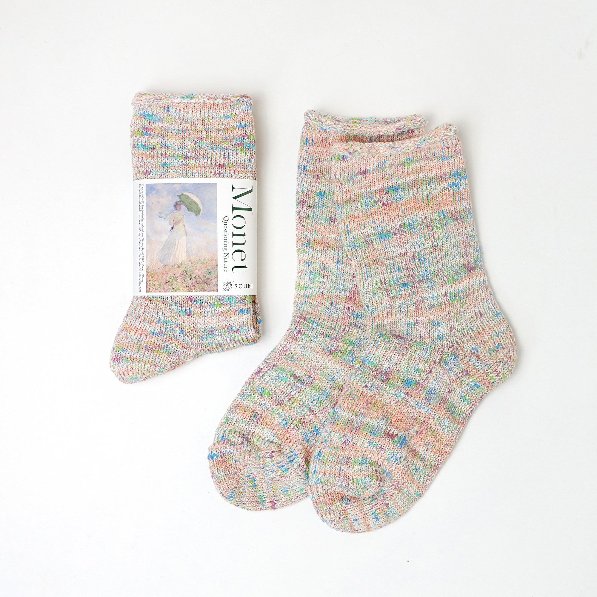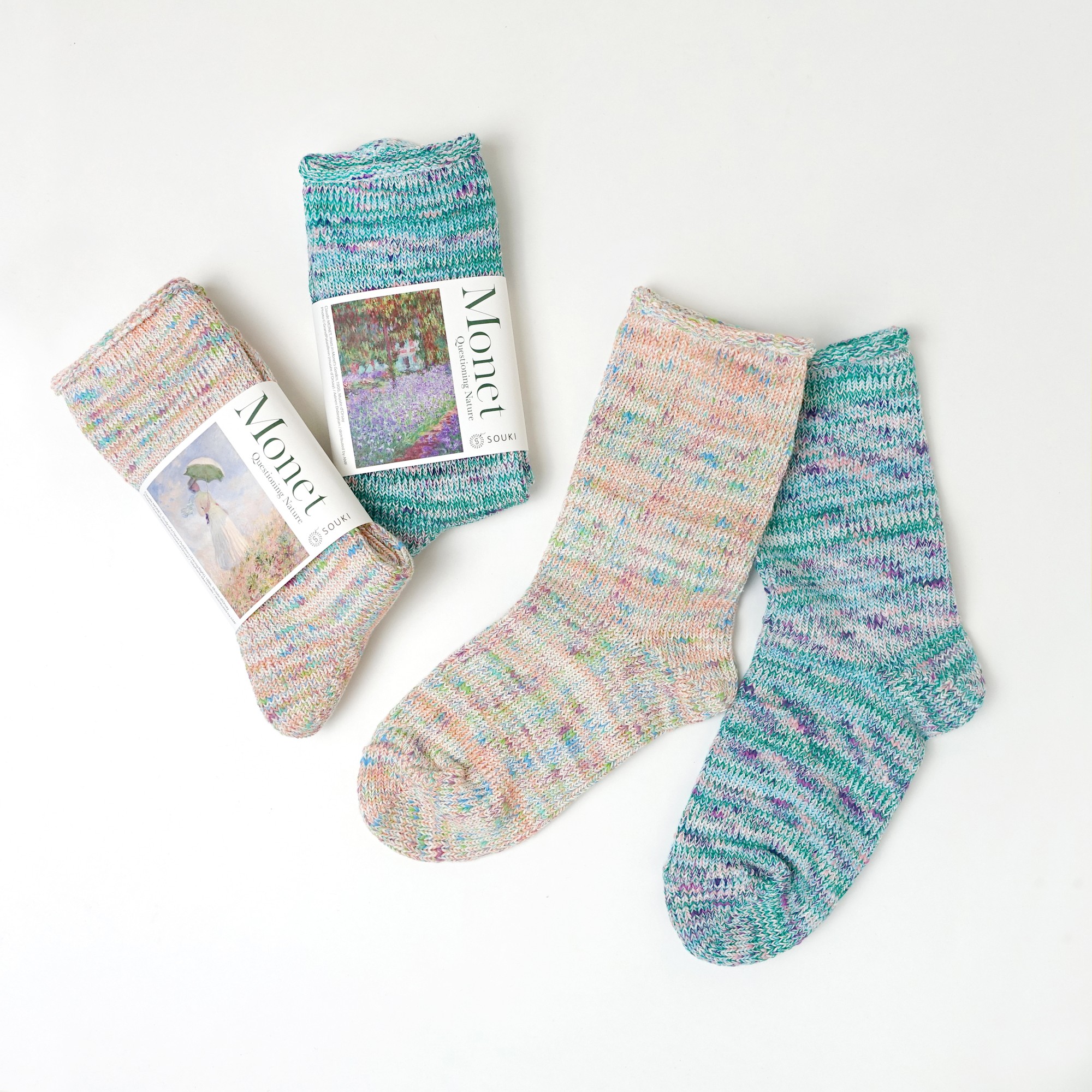 本商品は、モネの代表作である「日傘の女」、「モネの庭」をモチーフに制作しました。「日傘の女」をイメージしたソックスでは、草原を渡る光と風の中に、そっと溶け込む女性の佇まいを。「モネの庭」をイメージしたソックスでは、花や葉、土、水、そして光が重なり合う、庭の豊かな気配を表現しています。SOUKIが得意とするローゲージ編みにより、絣染めの糸で、複数色が混ざり合う色の奥行きと、ぷくぷくとした立体感を生み出し、モネの描いた“光と色の揺らぎ”を足元へと落とし込みました。
