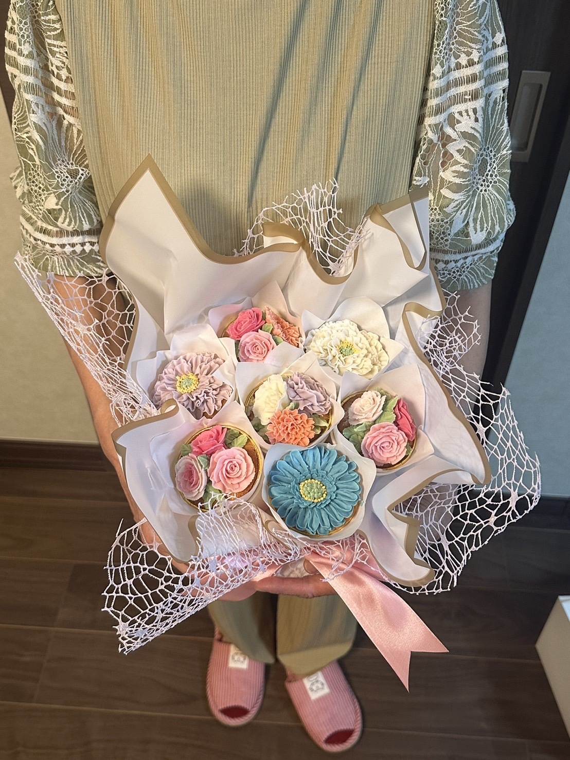 フラワーカップケーキは白あんにバタークリームを加えたコクのあるあんクリームを使用し、花びら1枚1枚を丁寧に絞り出しバラ等の花の形を作るケーキです。1個単位で購入していただけるので手軽に手に取っていただけます。