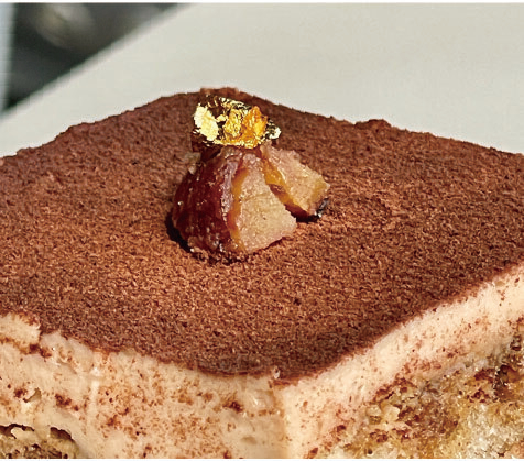 天面には輝く金粉と香ばしい栗のかけらをあしらい、まるで宝石のようにきらめく秋限定ティラミス。口に入れると、なめらかなマスカルポーネの奥からごろごろっと渋皮栗が顔をのぞかせ、ひと口ごとに異なる食感と栗の豊かな香りを楽しめます。層ごとにしみ込んだほろ苦いエスプレッソが栗の自然な甘さを引き立て、クリーミーでありながら軽やかな口どけ。見た目の華やかさ、栗の贅沢な存在感、季節感あふれる味わいが一体となった、特別な秋のひとときを演出する一品です。
