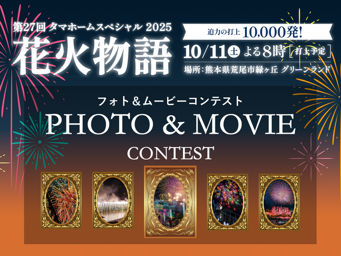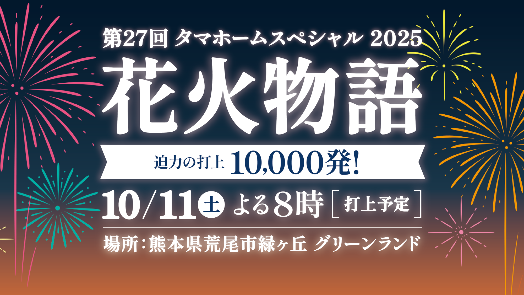 グリーンランドリゾート株式会社(本社:熊本県荒尾市下井手1616、代表取締役社長:松野隆徳)は2025年10月11日(土)に「タマホームスペシャル2025第27回花火物語」を開催します。30分間に10,000発をノンストップで打ち上げ、割玉を中心に変化柳や仕掛け花火といった異なる趣を持つ花火の数々をお楽しみいただけます。