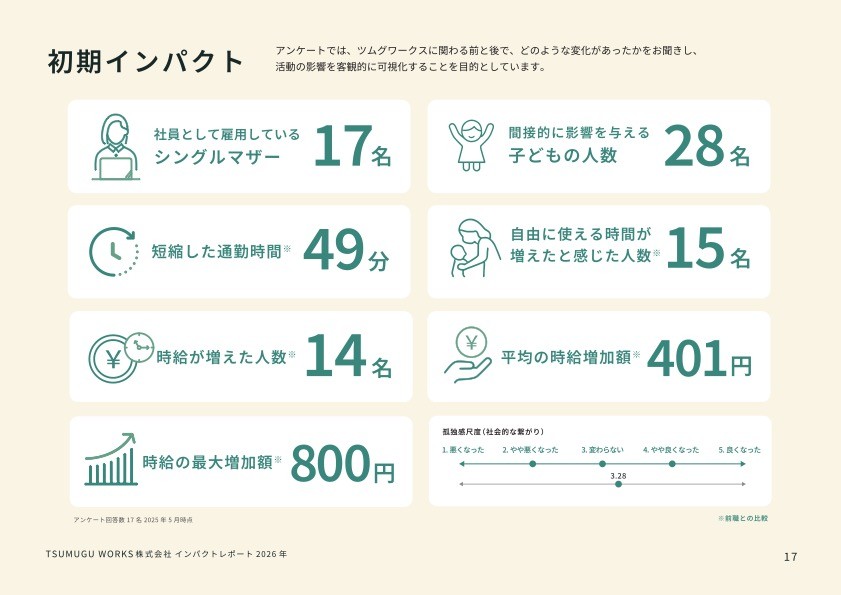 シングルマザー等の就労支援およびバックオフィス代行事業を展開するTSUMUGU WORKS株式会社(本社:東京都新宿区市谷田町2-8市ヶ谷科学技術イノベーションセンタービル2F、代表取締役:小原光弘)は、自社事業が社会に与えた影響を定量 / 定性の両データで可視化した「インパクトレポート2026年」を公開いたしました。