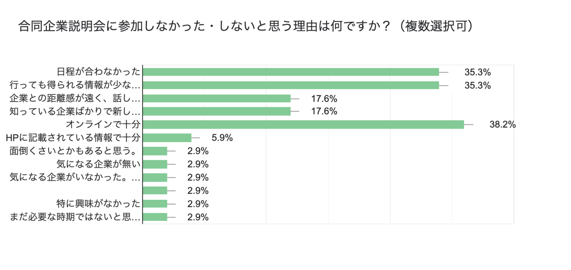 現役大学生(3年生〜4年生)を対象に2025年8月1日〜9月1日までの期間アンケート調査を行なったところ、合同企業説明会に参加しなかった・しない理由には「行っても得られる情報が少ない」「オンラインで十分」といった声が多く挙がりました。