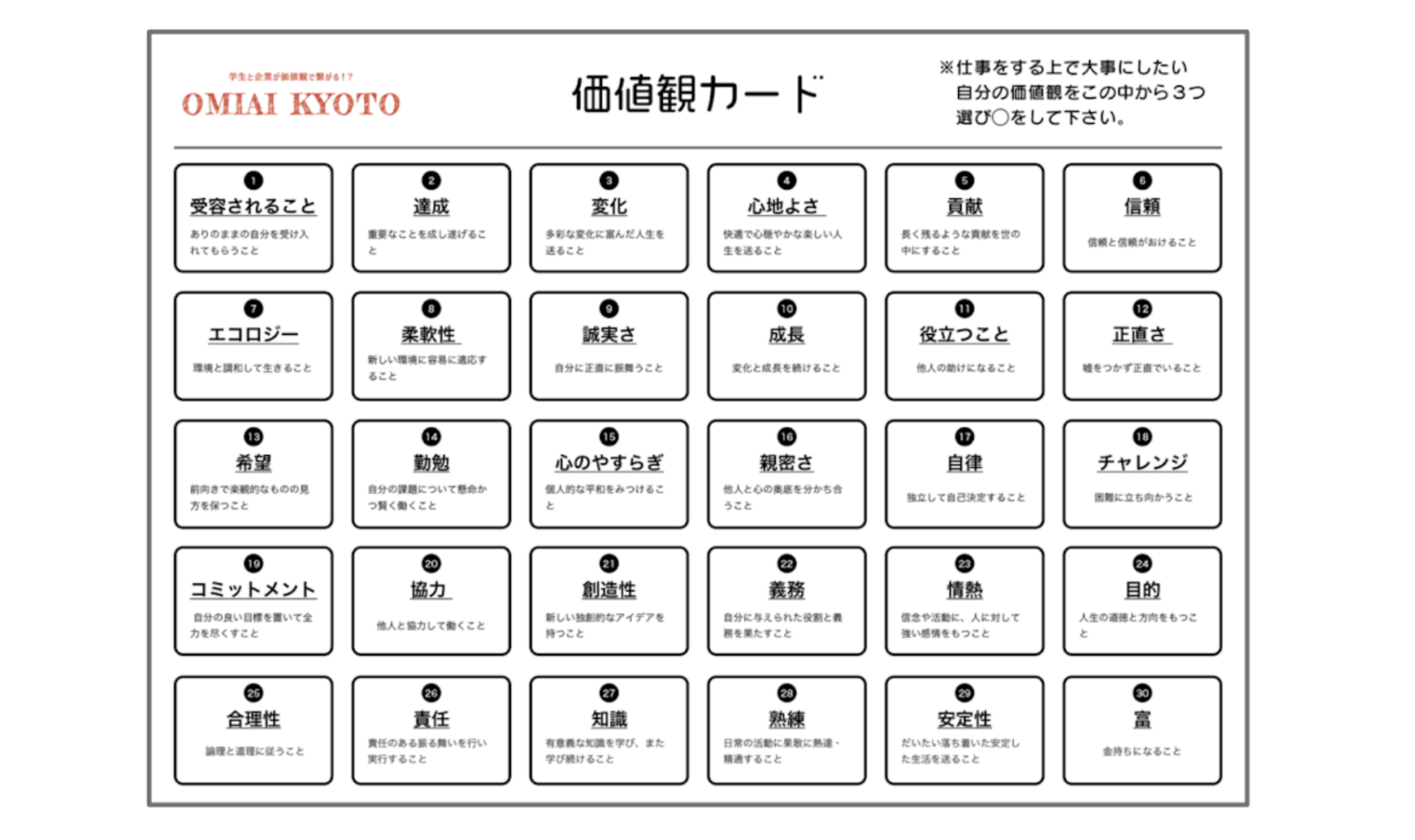 また、会話のきっかけとして「価値観カード」を用意しました。学生・企業それぞれが大切にしている価値観を3つ選び、互いに共有することで、自然と深い対話が生まれる仕掛けを取り入れました。