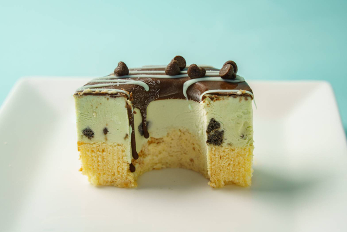 ほろ苦いココアのバウムクッキーがはいったバニラミントのムースにパリパリチョコをコーティング。その上にはチョコチップをあしらったチョコミント初級の方も食べやすいバウムクーヘン。