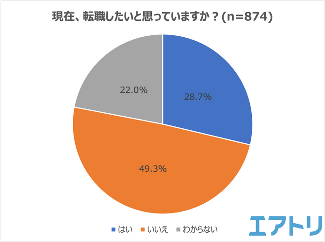49.3%の人が現在、転職をしたいと思っていない(いいえ)と回答しました。転職を「したい」人が28.7%、「わからない」と回答した人が22.0%となりました。