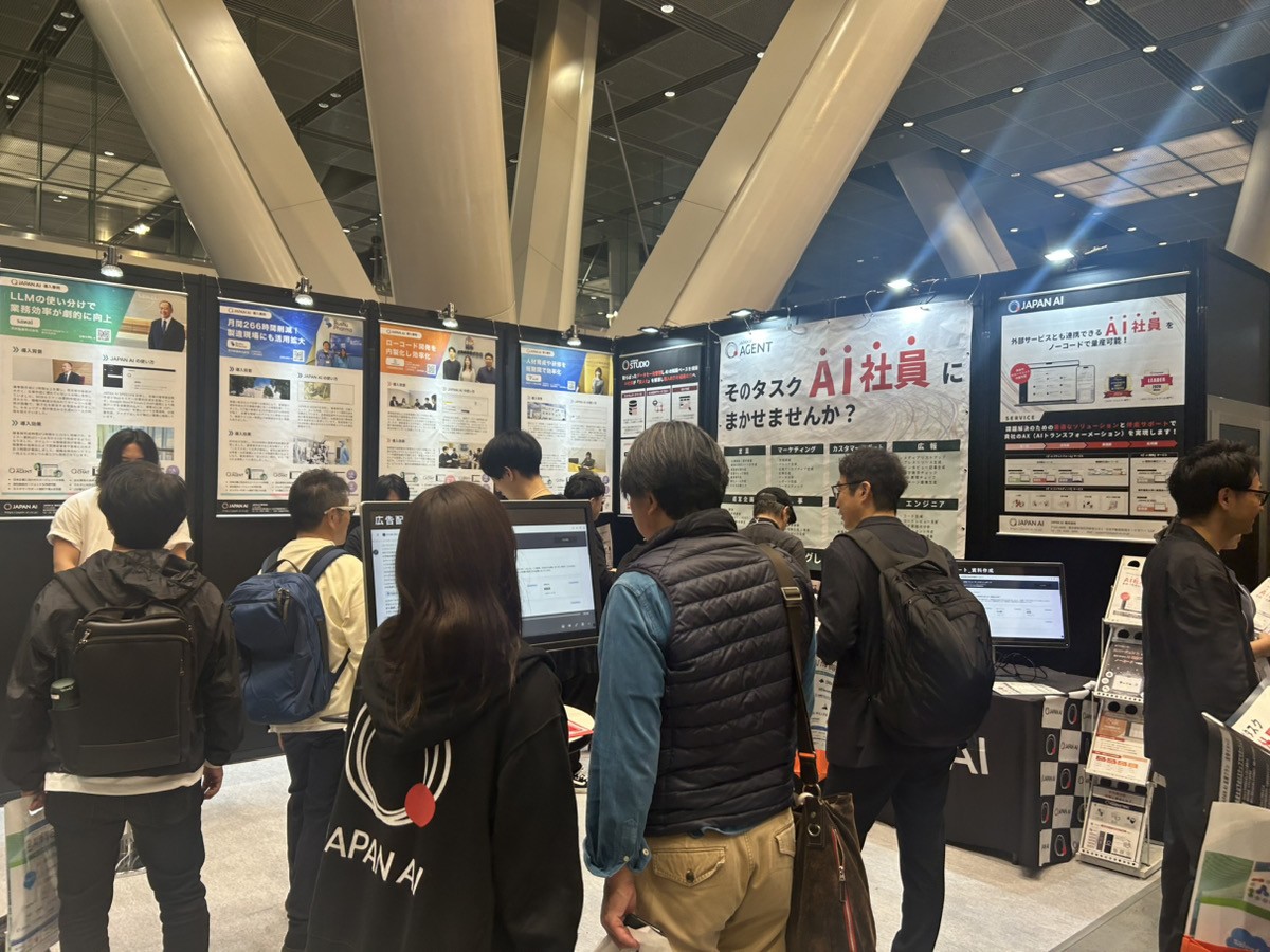 出展ブースエリアにおいても、来場者と出展企業との間で活発なコミュニケーションが行われています。各ブースでは、生成AIやAIエージェントを活用した最新ツールのデモンストレーションが披露され、「自社の業務課題をどう解決できるか」といった具体的な導入を見据えた相談が飛び交うなど、会場全体がAIビジネス創出の熱を帯びています。