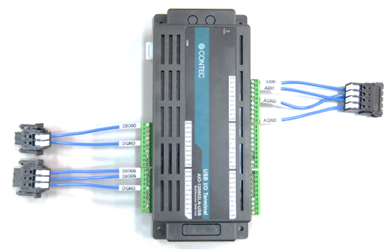 一般的な実験装置には荷重や変位などの状態を出力するコネクタがついています。そのコネクタとマルチ入出力ユニットを専用ケーブルで接続するだけでセットアップが完了します。
