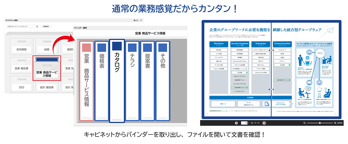 『eValue V Air mini』は、中堅・中小企業向けに、すぐに使える・低価格・カンタン操作を実現したクラウド型ドキュメント管理システムです。今回提供する「カンタンUI」では、紙の書類を整理する感覚をそのままPC画面上に再現。キャビネットを開き、背表紙のタイトルを見てバインダーを選び、ページをめくるようにファイルを確認できます。