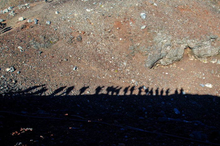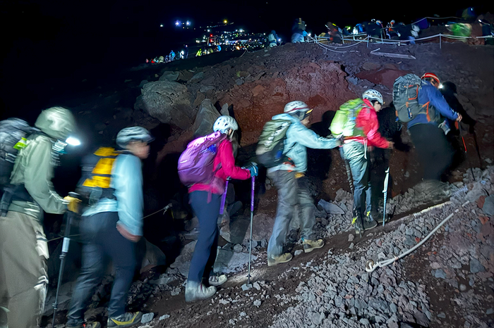 富士山五合目までを対象とした「文化を読みとくB(富士山の魅力)」は2023年度から、五合目から頂上までを対象にした「自然を読みとく(富士山の魅力)」が2024年度からスタート。今年度の現地演習は「文化を読みとくB」が9月11~13日、「自然を読みとく」は8月18~20日に行われ、頂上では今回初めて、山頂にある火口の縁を一周する「お鉢巡り」を体験しました。