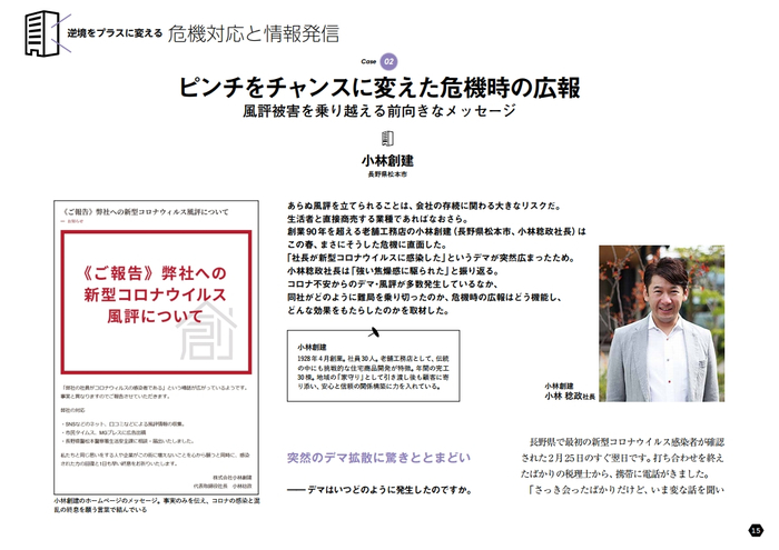 設立以降一貫して進めてきた働き方改革の取り組みを生かしていち早くニューノーマルに対応したランクアップ(東京都)、風評被害を受けながらも自社の考えを前向きに発信することで信頼を向上させた小林創建(長野県)を取材。コロナ環境下で打ち出した新規の施策や企画、広報に込められたメッセージを紹介します。また専門家インタビューを通じ、コロナ対応に求められるリスクコミュニケーションの基礎知識から、企業がデマや誹謗中傷を受けた場合の対策までを解説。さらに、過去に例のないような豪雨が頻発していることを受け、気象予測技術のこれからを名古屋大学宇宙地球環境研究所の坪木和久教授に語ってもらいました。