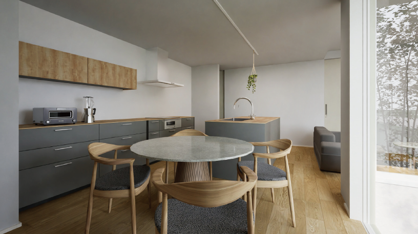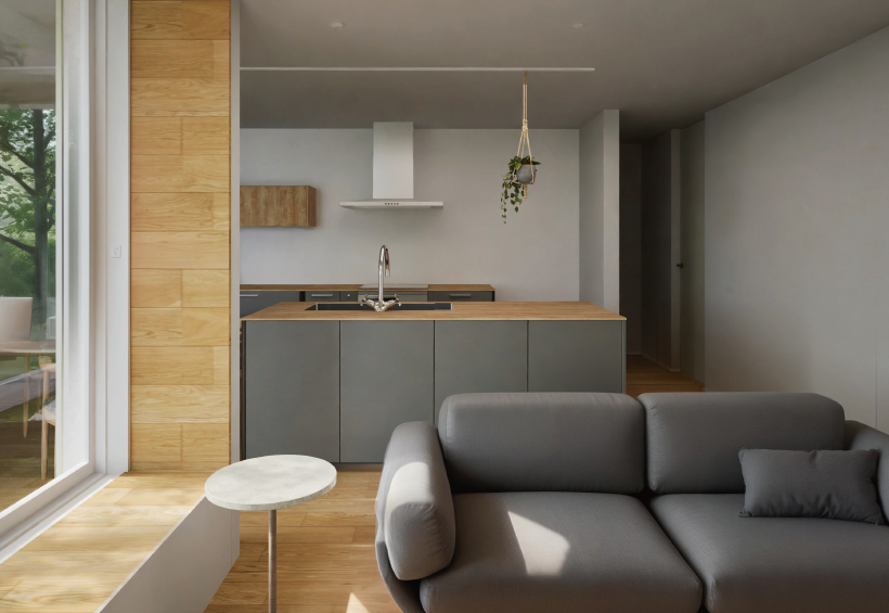 「少ないほど豊かである」という「Less is more」のコンセプトに基づき、装飾を抑え、視覚的なノイズを最小限にしたデザインが特徴です。また、塗り壁の白いファサードと無垢木の調和が、外観に自然な美しさと落ち着きを加えています。インテリアは「ノイズレス」な空間を提供し、静かな生活環境をサポートします。