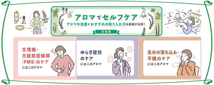 6月19日に公開するのは、新特集『アロマでセルフケア アロマの効果とおすすめの取り入れ方を医師が伝授!実践編』の生理痛・月経前症候群(PMS)時、ゆらぎ症状時、気分の落ち込み・不眠時のセルフケアにおすすめのアロマとその活用法をご紹介する内容となっています。
