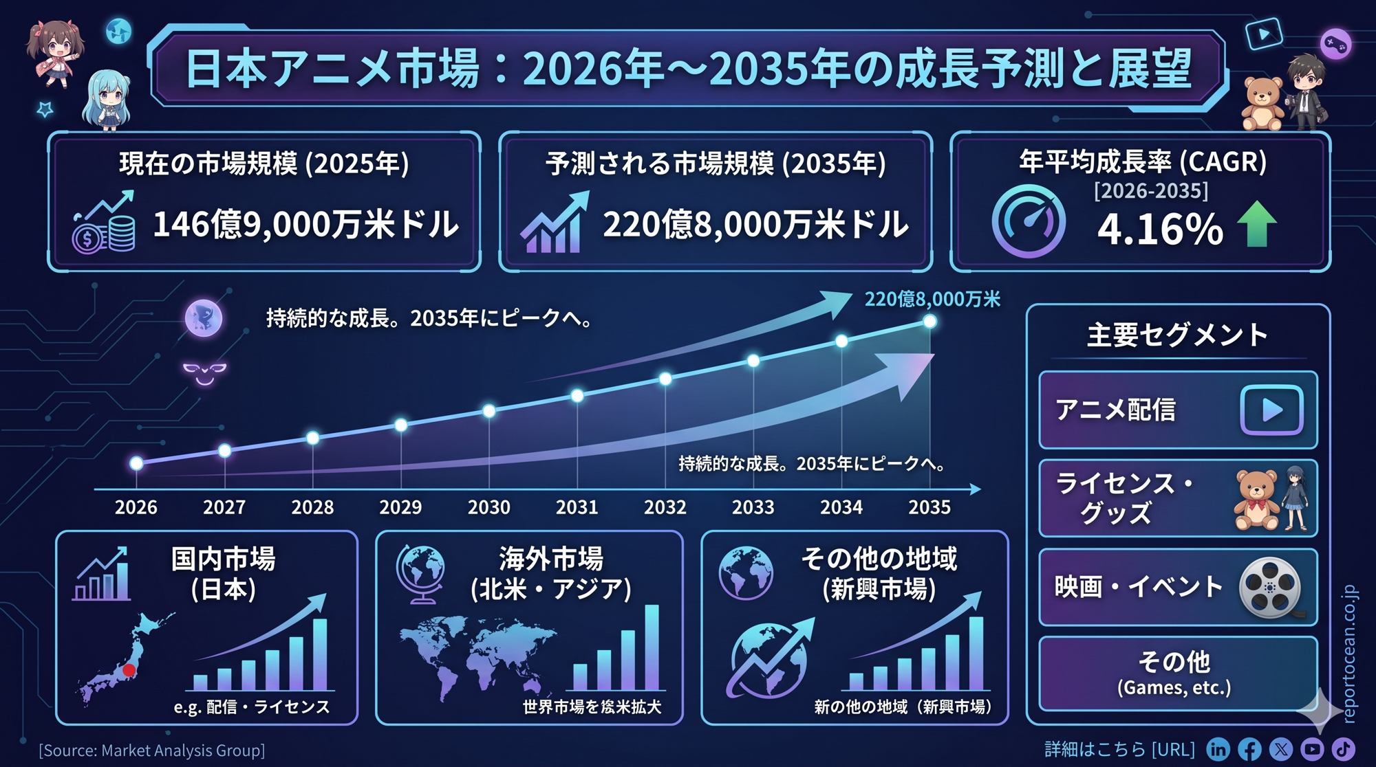 今後の成長を牽引するのは、海外ストリーミング需要の拡大、デジタル配信の高度化、そしてAI・XR技術との融合です。特に海外市場では日本アニメの視聴時間が増加傾向にあり、コンテンツ輸出ビジネスとしての重要性が高まっています。CAGR4.16%という安定成長は、リスク分散型ポートフォリオを求める企業にとって魅力的な投資先となります。