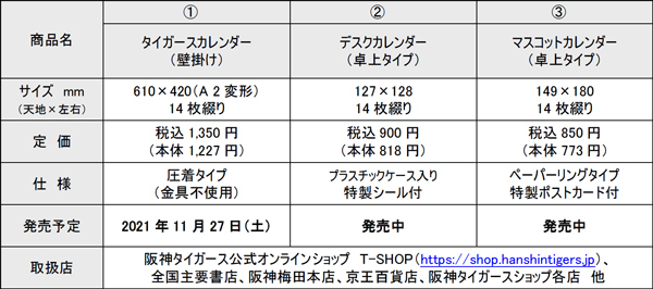 なお、卓上タイプの「阪神タイガースデスクカレンダー2022」、「阪神タイガースマスコットカレンダー2022」は好評発売中です。