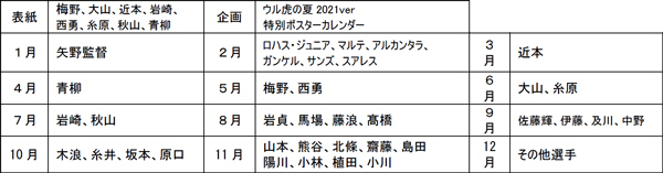 2021年シーズンの主力選手のベストショットを大胆かつ繊細にデザインしました。今回の企画ページは、ウル虎の夏2021特別ポスターカレンダーです。
