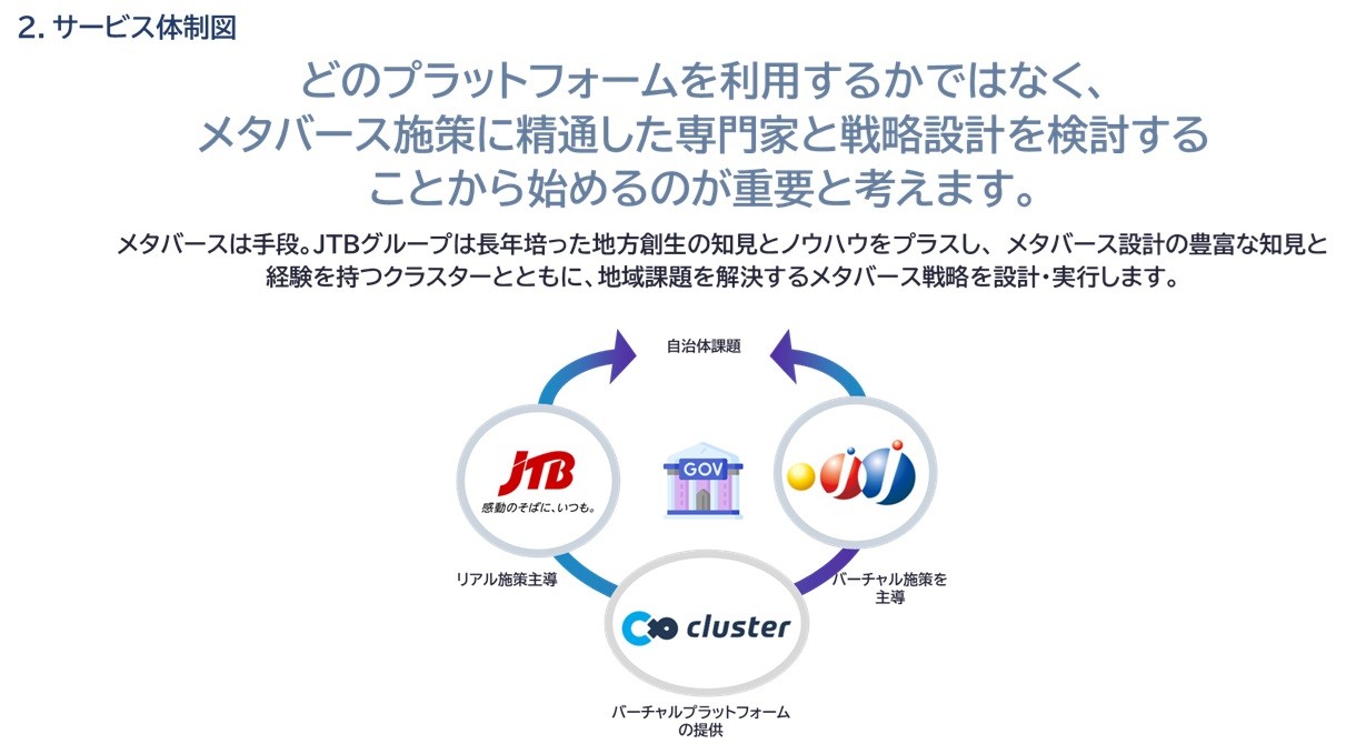 クラスター株式会社(以下、クラスター)は、株式会社J&J事業創造(以下、J&J)との共創により、全国の自治体が直面する人口減少や交流人口の拡大といった課題に対し、新たな解決策となる「ジチタイメタバース(※商標出願中)」のサービスを2025年10月23日に開始します。本サービスは、地域課題の解決と新しい価値の創造を目指し、株式会社JTB(以下、JTB)が各自治体への営業推進に連携します。