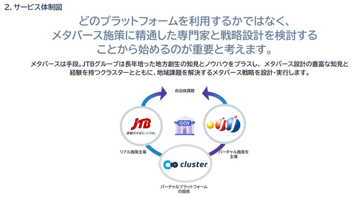 「ジチタイメタバース」は、J&Jが持つ「バーチャルDX」の戦略設計、JTBの地域に根差したネットワーク、そしてクラスターの持つ確かな技術基盤を融合した、包括的なサービスです。具体的には、以下の特徴を通じて、自治体の新たな挑戦をサポートします。