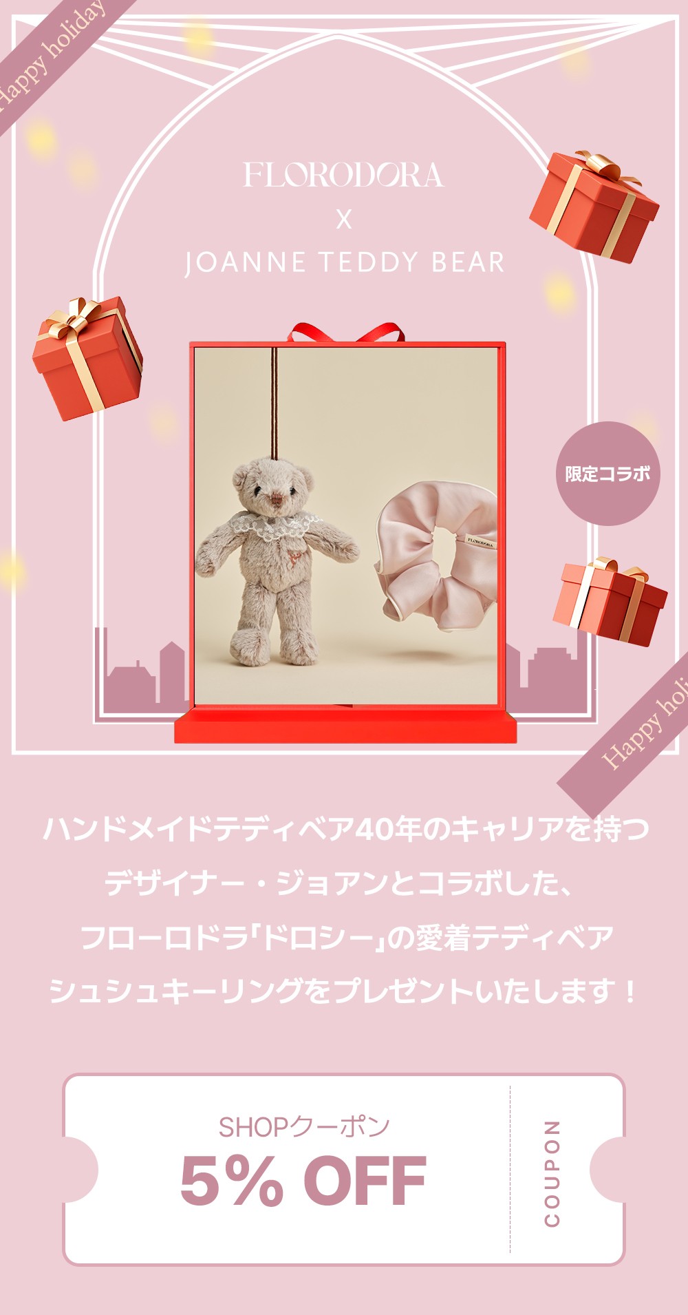 セール期間中、日本で根強い人気を誇るFLORODORAのシグネチャーオードパルファム2種をご購入のお客様にジョアンテディベアシュシュキーリングをプレゼントいたします。