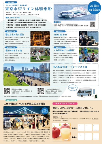 23日(日・祝)には、東京水辺ライン(水上バス)の体験乗船も。水辺ならではの休日をお楽しみください。