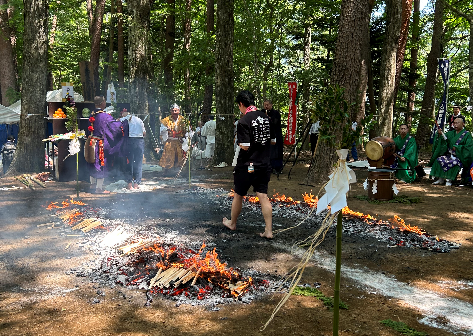 中腹で行われる大護摩供法要では、目の前で護摩木が燃え上がり、読経が響き渡る光景をご覧いただけます。五感で体験することができるこのシーンはまさに息を呑む迫力が。また、最後に執り行われる火渡り修行はどなたでも参加できます。