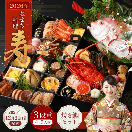 おせち料理 【寿】 三段重と焼鯛 (4~5人前)【2025年12月31日着】
