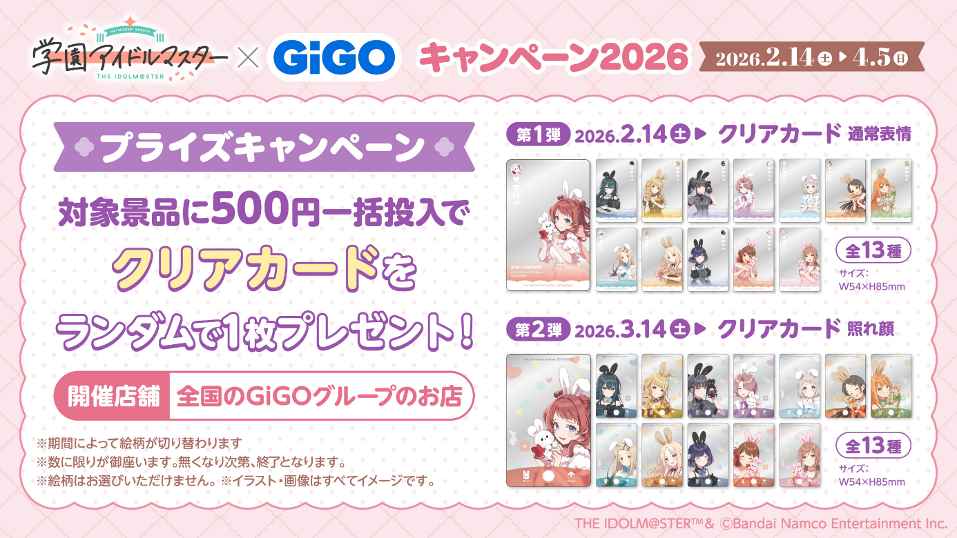 株式会社GENDA GiGO Entertainment(本社:東京都港区 代表取締役社長:二宮 一浩、以下「当社」)は、GiGOグループのお店におきまして、『アイドルマスター』シリーズの最新作、歌とダンスが上手くなるアイドル育成シミュレーションゲーム『学園アイドルマスター』とコラボした「『学園アイドルマスター』×GiGOキャンペーン2026」を2026年2月14日(土)より開催いたします。