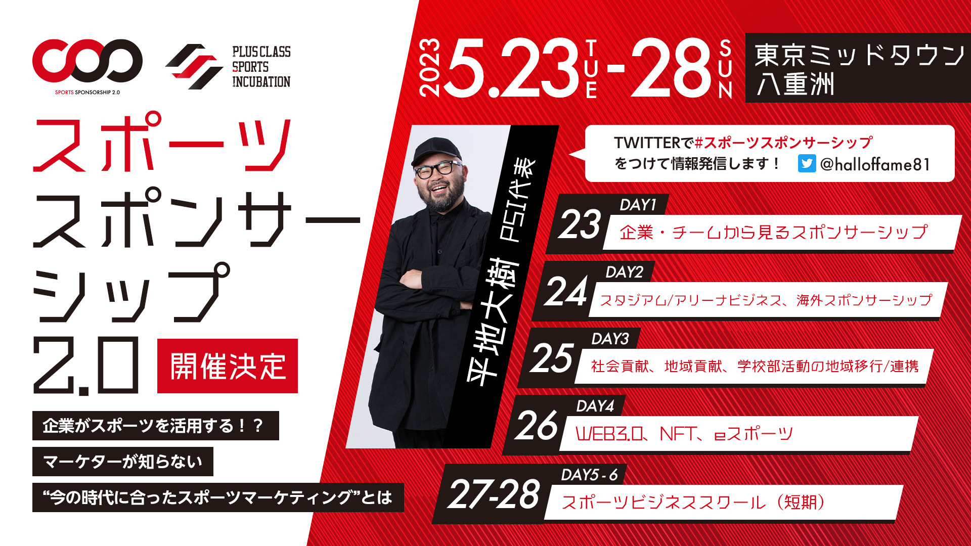 プラスクラス・スポーツ・インキュベーション株式会社(所在地:東京都千代田区、代表:平地 大樹、以下 PSI)は、2023年5月23日(火)から28日(日)の約1週間にわたり東京ミッドタウン八重洲にて『スポーツスポンサーシップ2.0』と題したスポーツのスポンサーシップの概念をアップデートするカンファレンスを開催します。