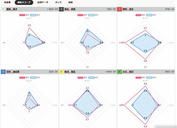 スポーツ報知を発行する報知新聞社が運営するボートレース専門サイト。今回の「ビーナスちゃんカップ」はもちろん、全レース場の全レースで「前日予想」、「直前予想」を展開しています。レース前の展示タイムなどを加味した「直前予想」を駆使すればボートビギナーでも簡単に予想ができます。各レースの「直前データ」をクリックすると、前日、展示(直前データ)両方の予想を「買い目」として提供しています。 ボートナビ報知の予想には、独自のデータを駆使した「報知スコープ」を採用。「エンジン」「選手」「コース」「展開」の4項目をそれぞれ5段階で評価。各項目とも様々なデータを基に計算式を設定。出走表確定の前日だけでなく、展示データ取得後のレース直前にも再度計算し、予想に役立つデータを提供します。全場全レースを無料で予想しています。ぜひ、ボートナビ報知をご活用ください!!