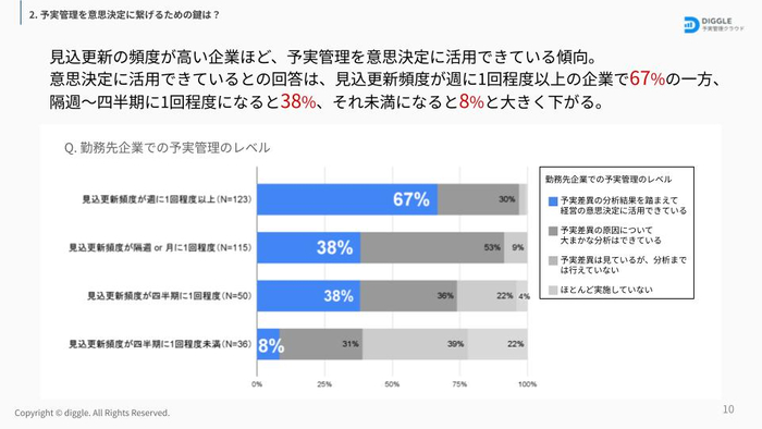 頻度の高い見込更新を行うことが経営の意思決定に貢献するために必要な一方で、見込更新頻度が高い企業ほど予実管理担当者の負荷が大きく、持続性に懸念があることが推察される結果となりました。