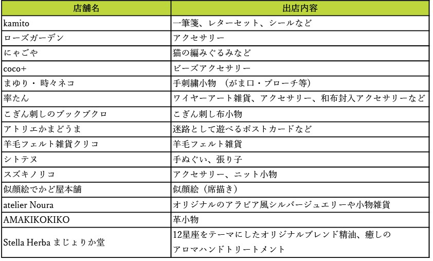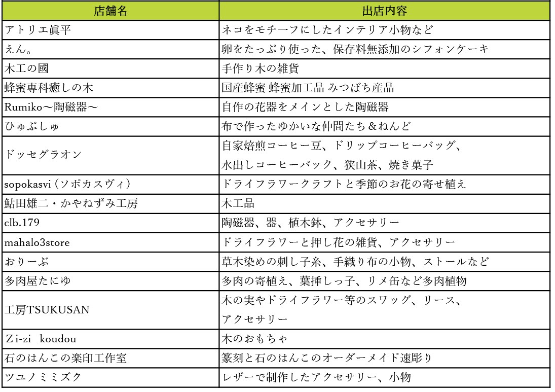 「深大寺手作り市」とコラボし、植物やボタニカルグッズ、手芸・工芸など世界にひとつだけの個性豊かな手作り作品の出店。農産物やキッチンカーも出店します。