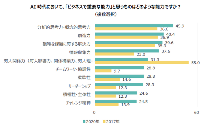AI時代に必要な能力:2020年第1位 「分析的思考力・概念的思考力」、2017年第1位 「対人関係力」