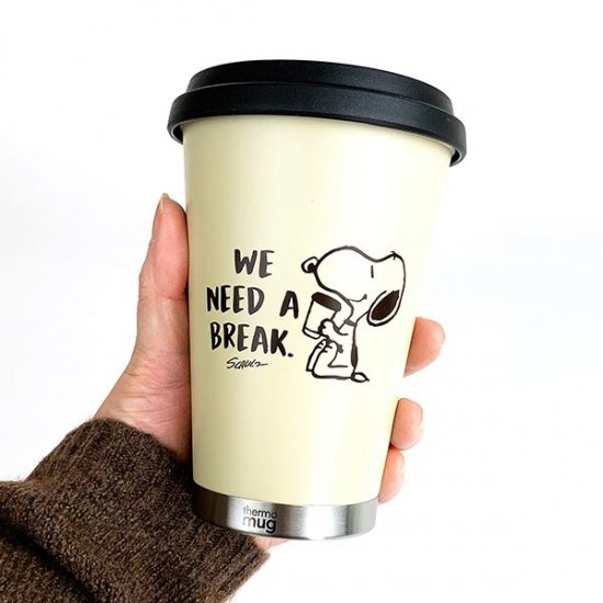 まったりカフェタイムのスヌーピーに、ほっこりしますね♡ミルクっぽいカラーもかわいいんです。