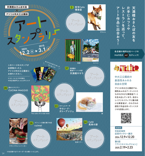 株式会社絆ホールディングス(本社:大阪市中央区)が運営する、障害者アートのアトリエ「アトリエ中大江公園前」と地域の魅力を発信する情報誌「天満橋おさんぽの友」は、共同で「天満橋おさんぽの友×アトリエ中大江公園前 アートスタンプラリー」を開催します。