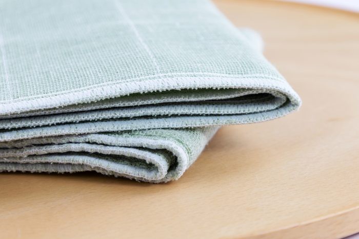 布巾のベースとなる糸には太めのものを採用。さらに、織布を八枚重ねることで、日々の使用にも耐えうる丈夫さを追求しました。長くご愛用いただけるよう、一枚一枚丁寧に仕立てています。