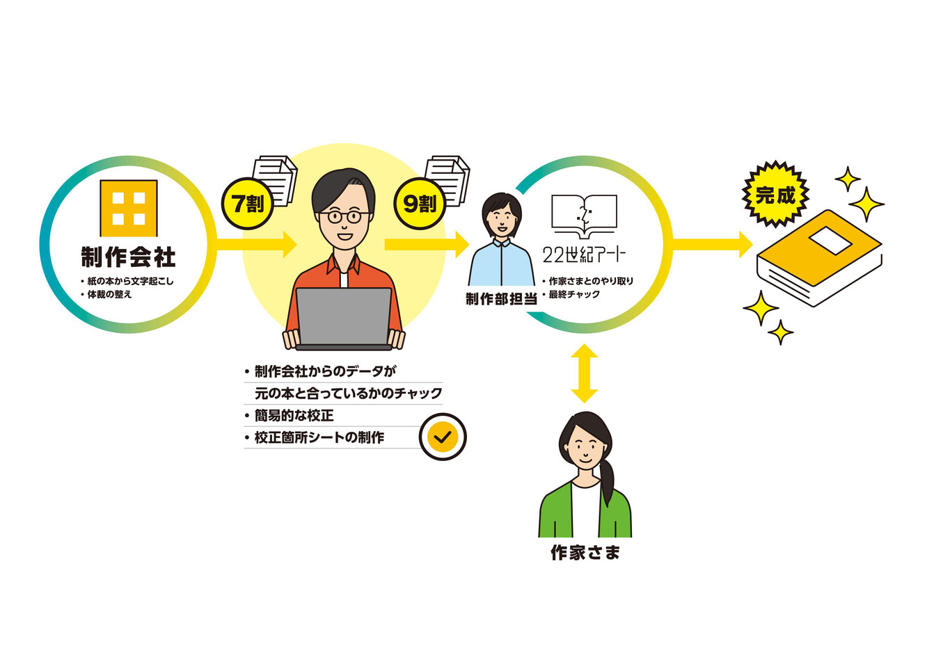 また、残り1割にあたる、最終校正や細かな作家様との調整等は、弊社が担当がいたします。
