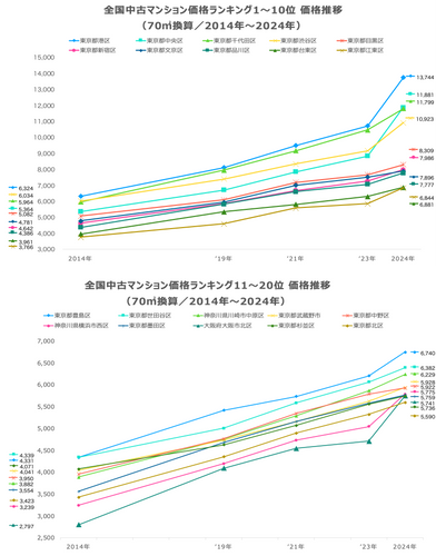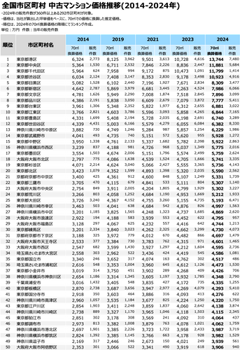 「マンションレビュー」で振り返る 2024年 全国市区町村中古マンション価格/騰落率ランキングを発表