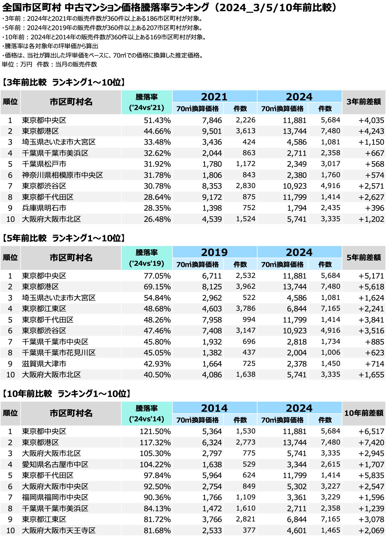 全国市区町村 中古マンション騰落率ランキング(2024年_3/5/10年前比較)