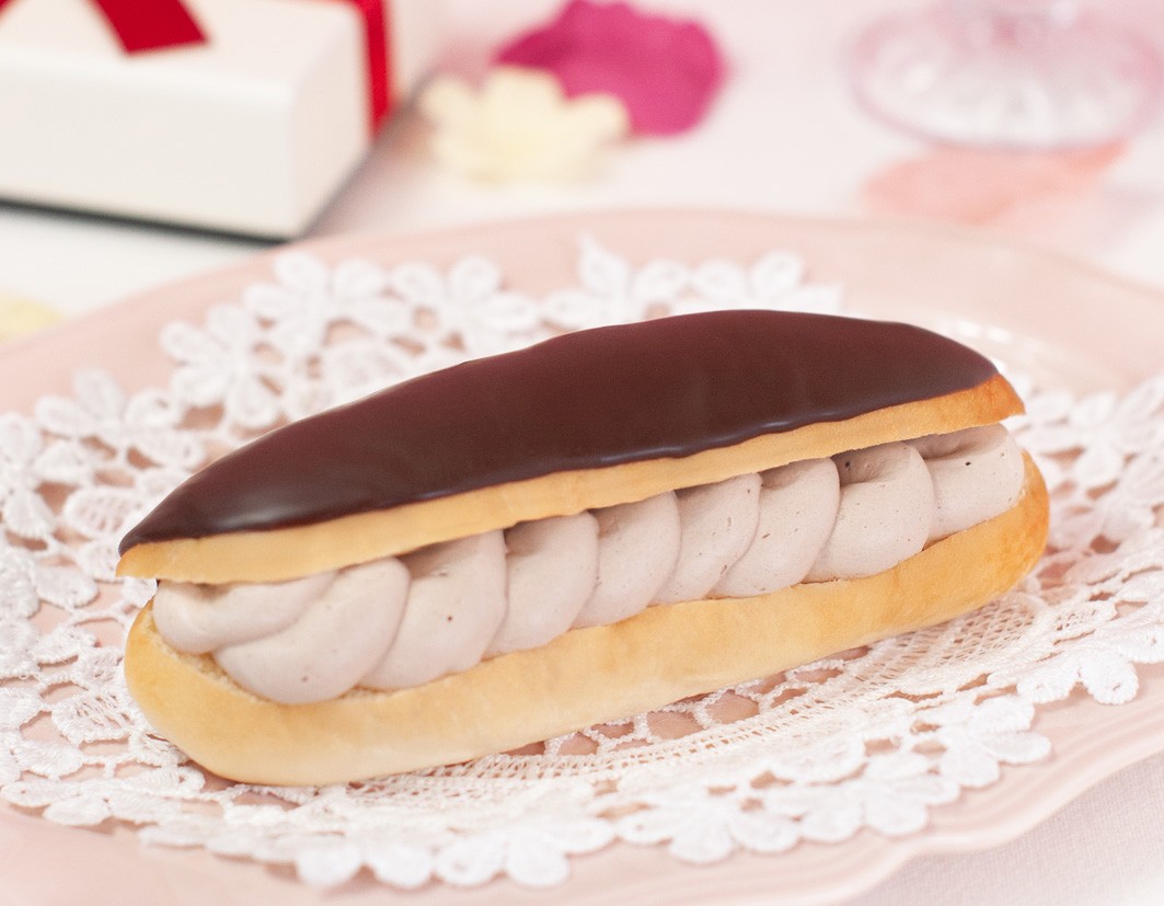 商品特徴:ふわふわなパンを「エクレア」風にアレンジ!口どけの良いとろけるチョコクリームをサンドしました。