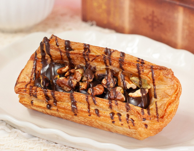 商品特徴:北海道産小麦が香るサクサクのデニッシュに、コク深いジャンドゥーヤチョコと香ばしいナッツを組み合わせた至福の味わい。