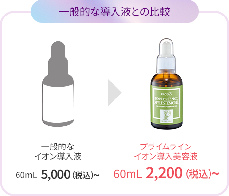 プライムラインのイオン導入液は、単独の成分を高濃度※に配合。成分をピンポイントで導入できます。防腐剤などの余分な成分を極力配合していない、ピュアな成分だから、お客様の目的と希望に合わせたイオン導入が可能です。