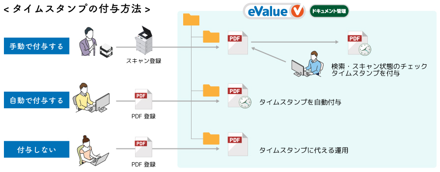 今回、「eValue V ドキュメント管理」は、証憑登録後に他者がチェックしてから手動でタイムスタンプを付与する運用、タイムスタンプを自動付与する運用、訂正削除履歴管理でタイムスタンプに代える運用を、企業の業務フローに合わせて柔軟に選択可能とします。また、「SMILE V 会計」との連携においても、1つの仕訳伝票に複数の証憑を紐づけて管理した際、それぞれの証憑文書を検索できるといった、仕訳伝票内の取引明細と証憑文書の紐付け設定の柔軟性・視認性を向上する強化を行います。