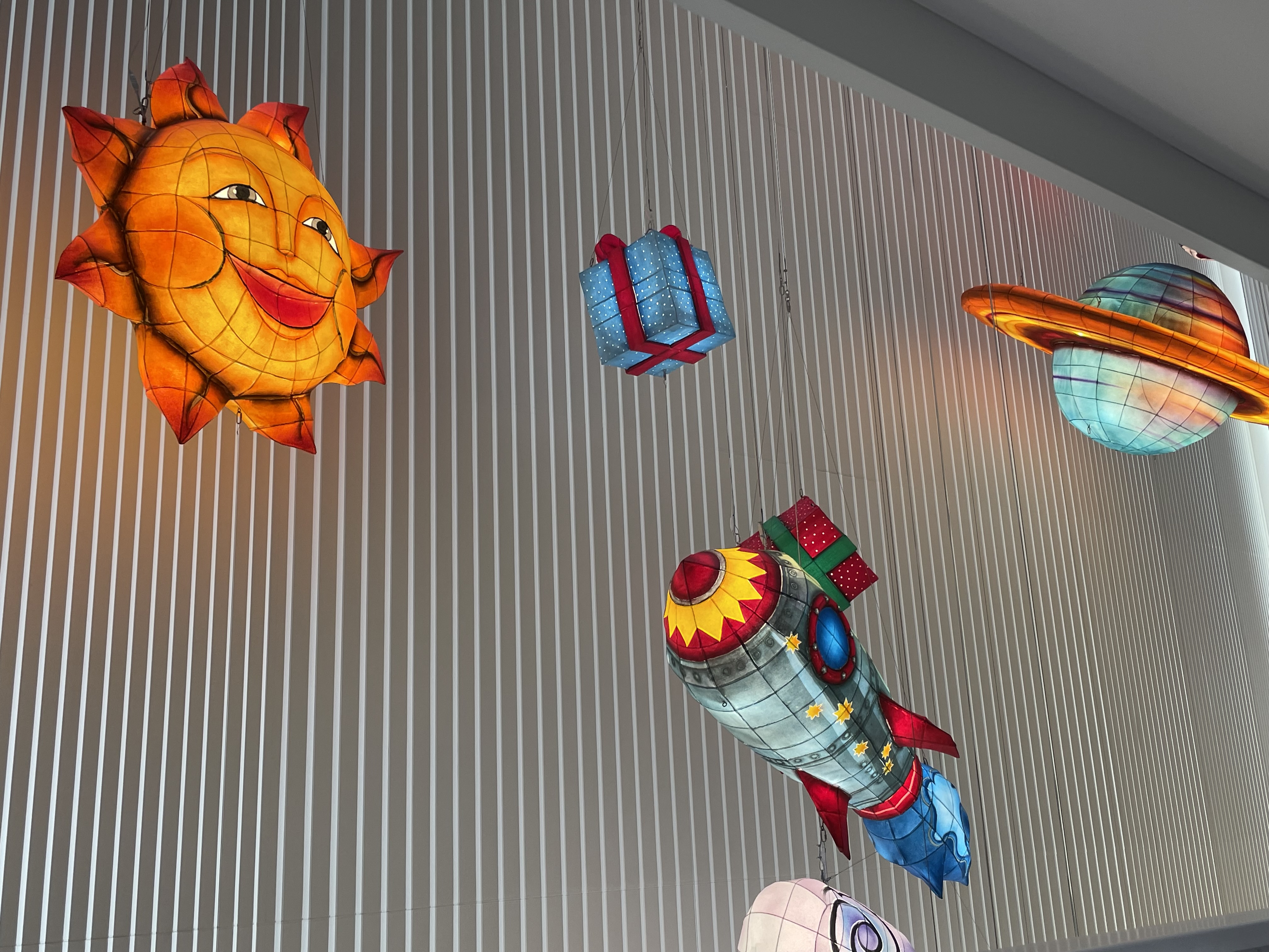 天野川流域の枚方市と交野市の一帯は「七夕伝説ゆかりのまち」として「七夕」を題材にした数多くの歌が詠まれました。そんな歴史的背景を館内デザインコンセプトに採用した施設らしく、吹き抜けに天体モチーフのねぶたが灯ります。