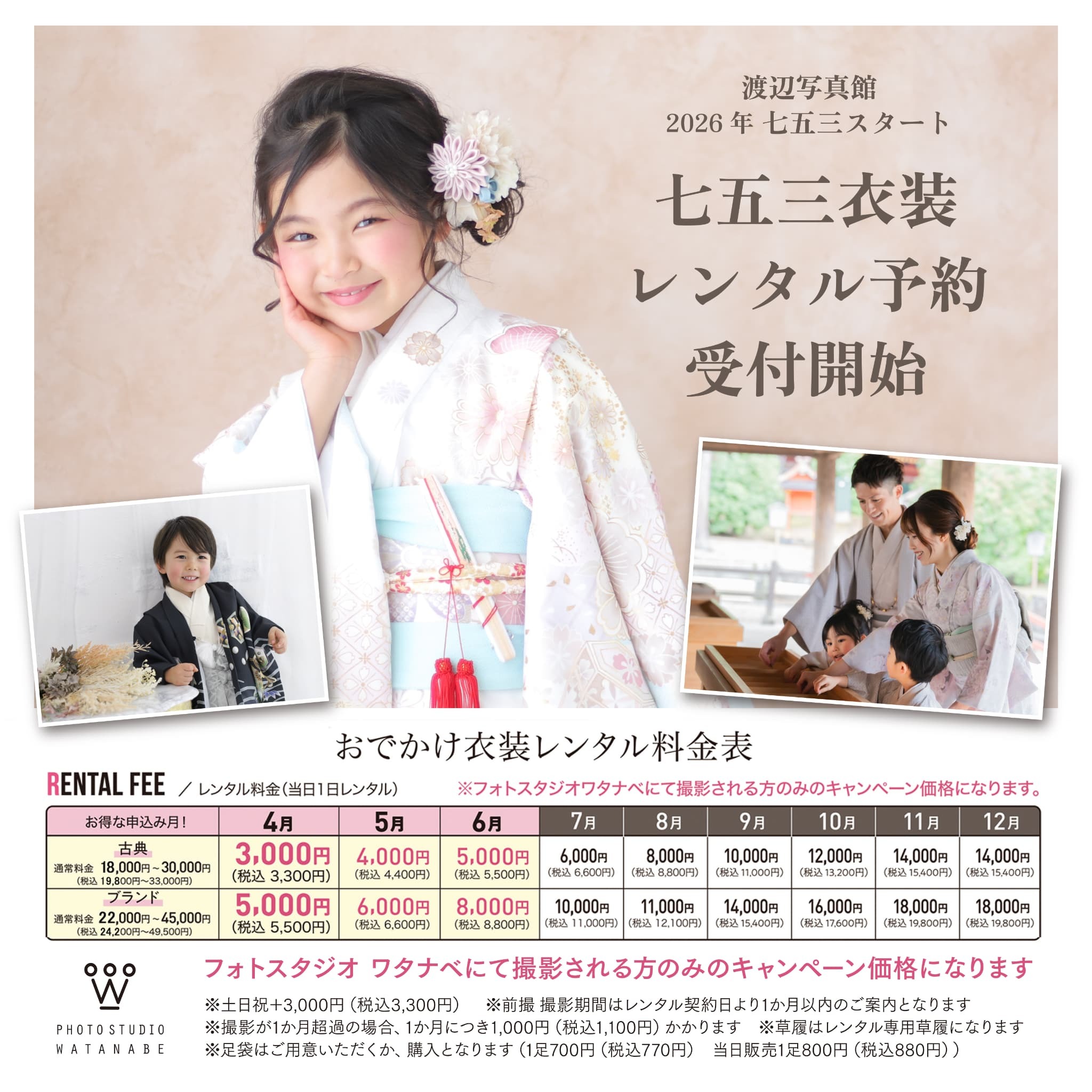 奈良県・京都府で6店舗を展開する老舗フォトスタジオ、株式会社渡辺写真館(本社:奈良県奈良市、代表取締役:鈴木 大明)は、2026年に七五三を迎えるご家族に向けた「2026年度 七五三撮影・お参り着物レンタルサービス」を、2026年4月より開始します。